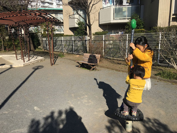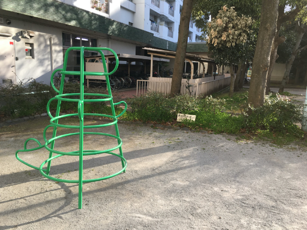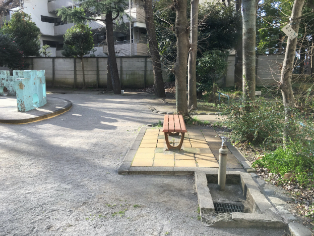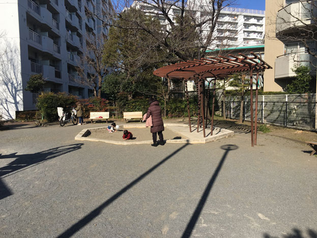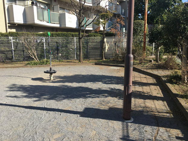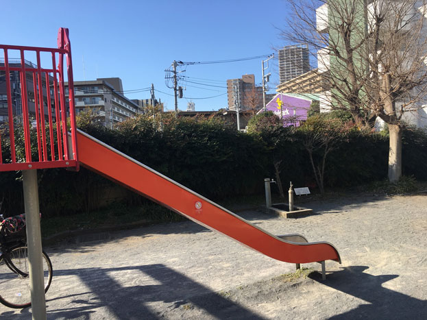 狛江通り沿いのにある小さな公園。赤いの滑り台が目印。。