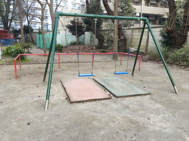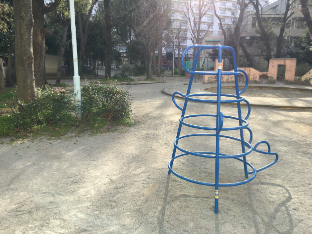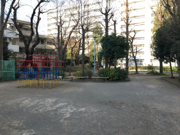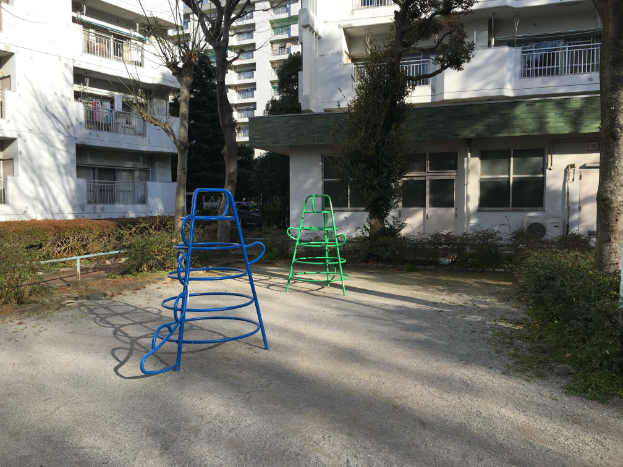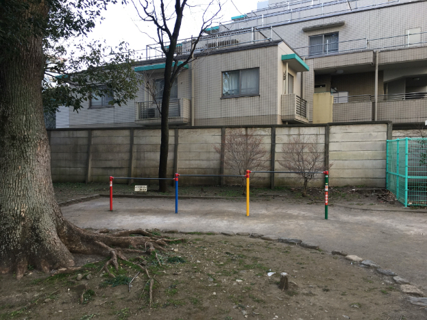 調布くすのきアパート内にある公園。おしろの外壁のようなモニュメントに囲まれた砂場が特徴的。 。