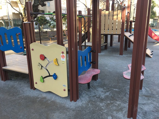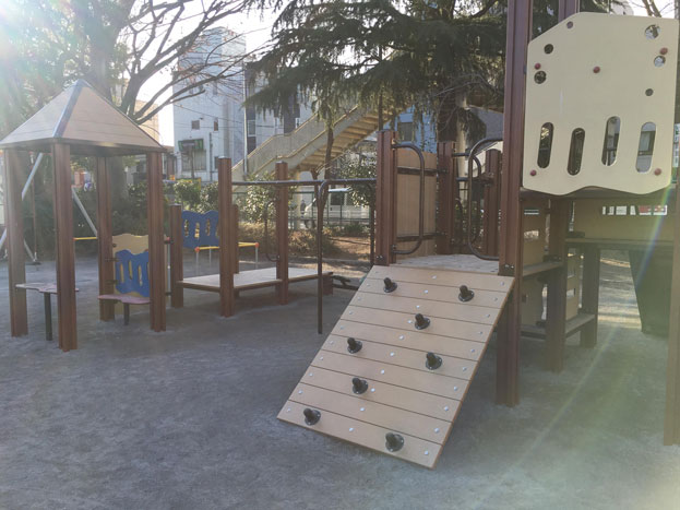 - 木製複合遊具(滑り台、太鼓はしご、ネットつり橋、パイプクライム、登り棒)