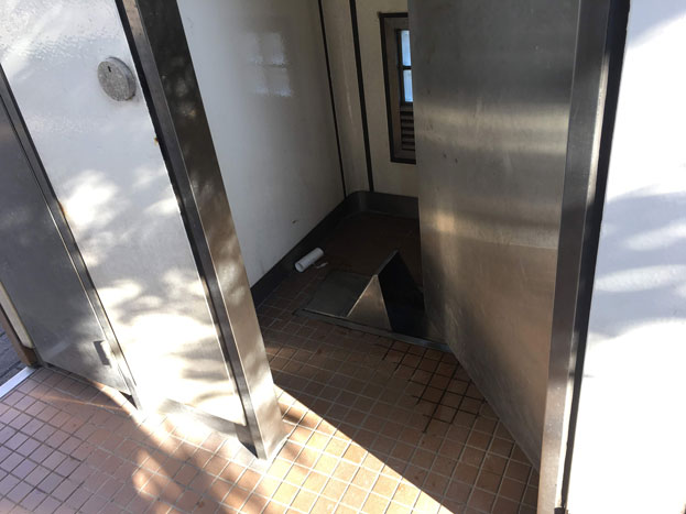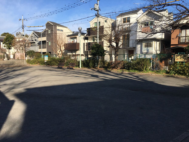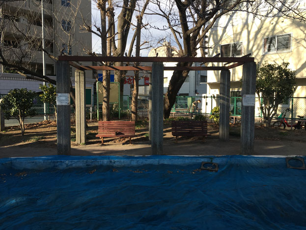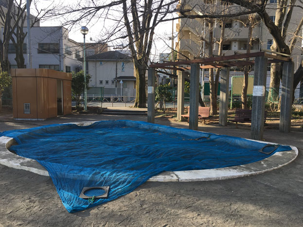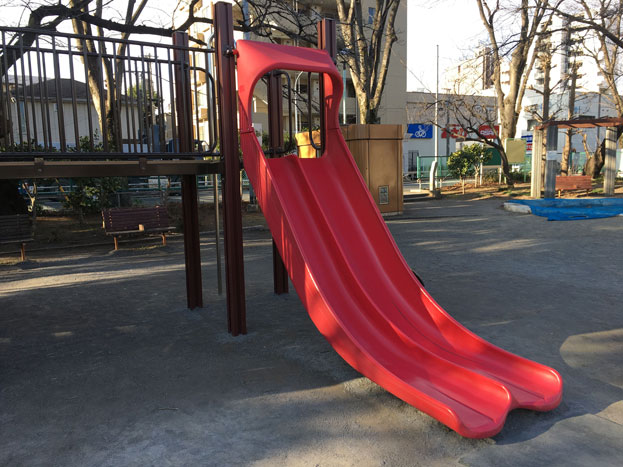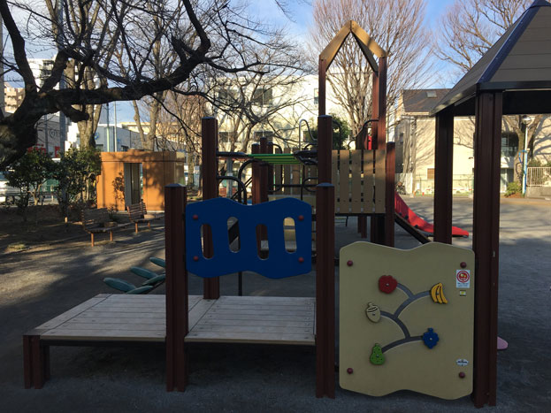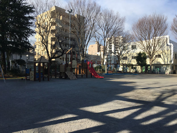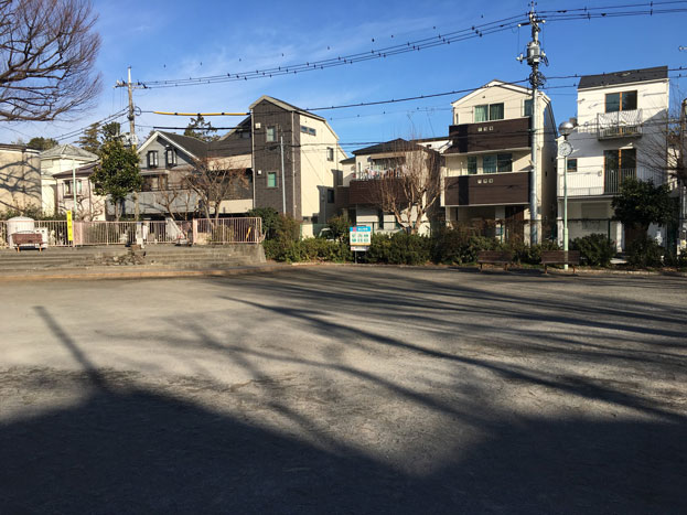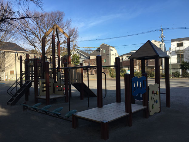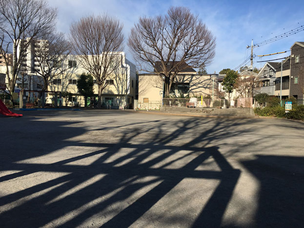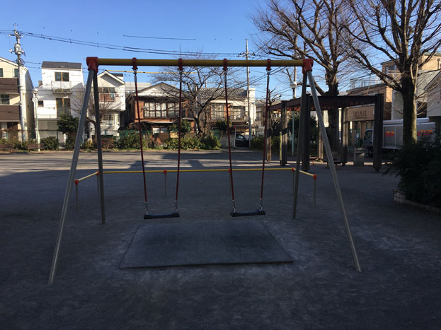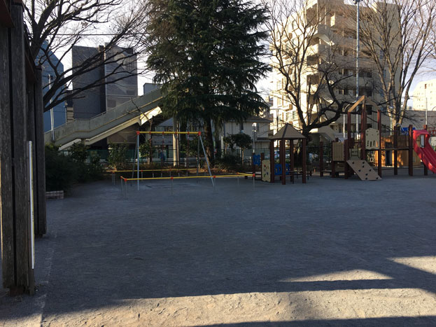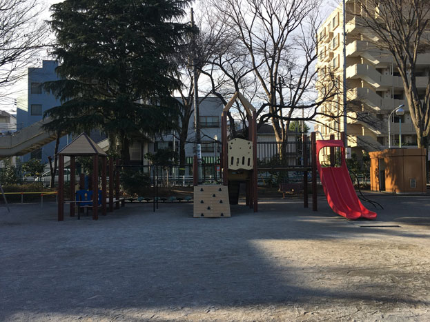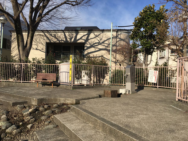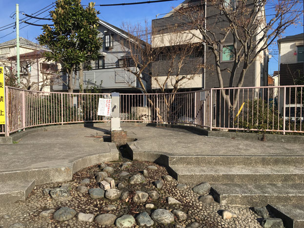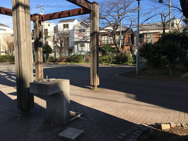 甲州街道沿いにある中希望公園。井戸の手押しポンプがあり、水遊びができる。